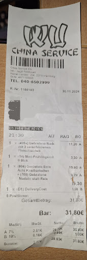Essen war lauwarm. Sehr wenig Fleisch aber hatte dadurch den Vorteil das man nicht zuviel dieser mindern Qualität hatte. Wo sich die dritte Fleischsorte unter den lauwarmen Nudeln versteckte kann ich nicht sagen. Nudeln, Fleisch 🤣, und Soße war nur ein Mischmasch nicht getrennt wie man es von anderen Chinarestaurant kennt.