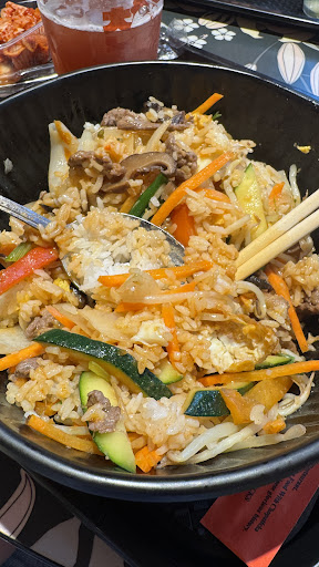 Bibimbab Wenn man koreanisches Essen servieren möchte, dann sollte es auch der richtige Reis sein. Bibimbab lebt vor allem davon, dass der Reis nicht komplett locker ist, sondern sich mit dem Gemüse und den anderen Zutaten verklebt. „Fliegender Reis“ ist leider das absolute Gegenteil, die Soße ist leider auch eine absolute Katastrophe … Man benötigt Gochujang und keine flüssige „Süß-saure-Soße“!