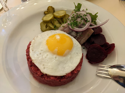 We had a great experience at this wonderful restaurant serving tasty Hamburg specialties. We ordered a tasting portion of the Labskaus, which is a Hamburg specialty. At first glance, I thought it looked a bit like a beef tartare, so I half expected the meat to be raw. The meat was definitely cooked, and it was very tasty, so much so that we almost regretted not getting the full portion. I also had the Kutterscholle Finkenwerder Art, which is a fried fish dish that is also a Hamburg specialty. It was very unique, although I found it a bit challenging to eat with how many bones there were in the fish. I'm sure this is because I'm not very practiced at eating fish, and not a reflection of their dish. I also loved the boiled potatoes that came as a side. Boiled potatoes are a weird thing to love, but these ones were soft and warm and very well-seasoned. I was also impressed with their house salad, from the variety of veggies to the tasty dressing used. The service was warm, and the restaurant had a nice dining environment. The prices were a bit higher, but given the quality of the food and service and the elevated dining environment, I thought they were quite reasonable. The only complaint I have is I thought the 8.50 euro charge for a bottle of water was a bit pricy. Overall I'd highly recommend this restaurant to anyone looking for...