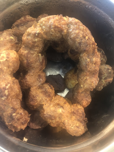 Alles super lecker - das Fleisch war leicht mit einem roten Pulver, ich denke Sumak gescheckt zu haben, bestäubt. Wunderbar zart und toll gewürzt. Der Salat dazu frisch und knackig. Zudem gab es noch ein kleines Schälchen mit Zuckermandeln und "ich weis nicht wie das auf Deutsch genannt wird".