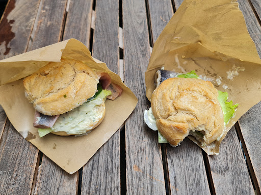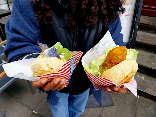 Tiny place with amazing fischbrötschen. I only recently arrived in Hamburg and heard everywhere that this was what you had to eat. To be honest with you I was quite sceptical. A bit of fish in a white roll? How good could that be? Wouldn't smoked fish be better on some dark rye with a some pickled cucumber? I tried two different types with Bismarck herring and Matjes herring and both were sensational. Large, fat and juicy pieces of herring in super fresh bread rolls with lots of herby mayo. I asked them to put some cucumber in each role and they looked at me like I was mad but put a derisory single slice in each. However, I do have to warn you that eating them is impossible to do without getting totally covered. I haven't been this covered in food remains since primary school when Mrs Thomas wouldn't let me eat at the big table because I was such a messy eater. I had to go home and have a shower afterwards. Looking at what some of the people were eating in the tiny dining area, the fish and chips did not look that impressive but just go for the...