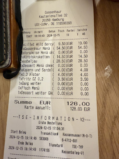 Read moreAm heutigen Tag, 15.12.24 hatte ich für 17Uhr einen Tisch reserviert. Wir wurden zum Platz begleitet und von der Sekunde an wurde es einer der schlechtesten Restaurantbesuche überhaupt. Der White Berry Lillet hatte kaum Alkohol und schmeckte fade. Das Brot, was an den anderen Tischen gereicht wurde, hatte man bei uns vergessen und kam nach 30 Minuten und auf Nachfrage. Wir bestellten ein Menü mit Lachs und einmal selber zusammengestellt mit dem Fisch "des Tages" (Kabeljau). Die Vorspeise dauerte 30 Minuten und war ok. Dann kamen die vergessenen frittierten Kapern und Sardellen nach 2maliger Nachfrage- leider war das alles inzwischen kalt. Der Hauptgang mit dem Lachs war falsch. Es wurde ein Schnitzel geliefert. Den Lachs nun neu zu bestellen, würde- Zitat, nochmals 40 Minuten dauern. Wir waren zu dem Zeitpunkt schon fast 2 Stunden im Restaurant. Unsere Gläser waren leer, und erst auf Anfrage brachte man uns weitere Getränke. Mein Kabeljau war scheinbar mal vom Schaum umgeben, der dann in der Küche, weil es so lange dauerte, zusammengefallen, und der Fisch schwamm nur in geschmackloser Flüssigkeit. Man entschuldigte sich für den Fehler mit dem falsch gelieferten Menü und die Getränke sollten "aufs Haus" gehen. Am Nachbartisch wurden 3x falsche Bratkartoffeln geliefert, an einem anderen Tisch mit drei Mädels, wurden von drei bestellten Desserts nur eines geliefert. Die Mädels zahlten sofort und gingen. Meine Rechnung war ohne jeglichen Abzug. Es wurde nichts "aufs Haus" gebucht. Da ich "null" Bock auf irgendwelche Diskussion hatte, zahlte ich die 130€ mit der Gewissheit, nie wiederzukommen. Das war alles, tatsächlich alles, unterirdisch. An nahezu jedem Tisch kam falsches Essen, oder gar keines. Wir waren gefühlt, 3 Stunden vor Ort und völlig genervt. Einfach inakzeptabel. Hoffnungslos überfordertes Personal, keine Kommunikation mit der Küche. Planlos umherlaufende Mitarbeiterinnen. Die einzige Mitarbeiterin war das Mädel an der Bar. Aber eine alleine kann das Chaos...