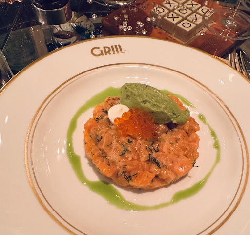 Da wir kleinere Portionen erwarteten, haben wir vorweg eine Seafood-Etagere für 4 Personen bestellt. Diese können wir empfehlen, optisch und geschmacklich einwandfrei. Bei den Hauptspeisen sah es schon anders aus. Mein Geschäftspartner wollte das Kalb medium, ich medium rare. Sein Kalb kam mit deutlichen Grillstreifen an, meines ohne Grillstreifen, sah eher nach sous vide aus – sehr merkwürdig in einem Grill... Die Qualität war unbefriedigend. Ich hatte das Kalb empfohlen, weil es in der exzellenten Sansibar auch aus Holland kommen sollte und dort immer sehr zart ist. Hier im Grill war es zäh und 10 € teuer zzgl. Beilagen a je 6-15 €. Der Fisch für die Damen kam etwas später und war maximal ein Babysteinbutt – auf der späteren Rechnung wurden dafür 184,- € ausgewiesen, natürlich zzgl. Beilagen. Dieser kostet in der Sansibar auf Sylt 55,- € inkl. Beilagen und schmeckt auch noch besser. Im Grill gibt es kein Champagnerkraut oder andere kreative und gut schmeckende Beilagen – dafür Essiggurkensalat und Gratin. Geschmacklich waren die Hauptspeisen allenfalls Mittelmaß.