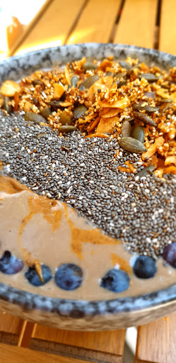 Read moreEine Freundin und ich waren das erste Mal da. Zuvor haben wir uns bei Instagram Fotos angesehen, damit wir einen Eindruck der Speisen bekommen. Wir haben am Tresen bestellt, 2x Bowl, 2x Kaffee und 1x Smoothie. Nach 20 min kam der Smoothie, auf Nachfrage für den Kaffee gab es die Antwort: der kommt mit der Bowl, damit alles perfekt ist. Wofür? Instagram? Mit Kaffeedurst etwas über 20 min warten, ist nicht so schön. Die Bowls sind überwiegend vegan (Granola gibt's als vegane Option) Ich finde es schade, dass die vegane alternative zum Kaffee und auch für das Granola extra kostet, obwohl es von vorn herein vegane Gerichte gibt. Zu den Bowls kann man sich 3 verschiedene Toppings wählen (goji Beeren, Kokosraspel, Haselnüsse (oder Krokant?), Blaubeeren, Äpfel oder Bananen. Ich entschied mich für die Himbeer Hafer Bowl mit den 3 verschiedenen Früchten. Ich war etwas enttäuscht, als ich mein Essen bekam. Pinken Hafermatsch hatte ich nicht erwartet. Es war nicht weich genug für overnight oats, aber schon zu matschig, als das es frisch gemixt war. Wenn ich zuhause Müsli mache und es zu lange stehen lasse, hat es genau diese Konsistenz. Die Himbeere konnte ich leider überhaupt nicht schmecken, da alles von Zimt übertönt wurde. Zum Glück esse ich gern Zimt, dieser war nämlich nirgends erwähnt. Das Topping sah nicht so hübsch aus, wie das die ganzen Instagram Bilder zeigen. Es war lediglich klein geschnittenes Obst, dass draufgelöffelt wurde. Alles in allem leider nichts besonderes. Müsli und Kaffee kann ich auch zuhause machen. Service gab es auch nicht groß. Das am Tresen bestellte Essen wurde an den Tisch gebracht. Das war es aber auch. Keine Nachfrage wie es war, oder ob es noch etwas zu trinken sein darf. Die Einrichtung ist schön, das Geländer an der Treppe zum Klo scheint nur Deko zu sein. Es wackelt gefährlich wenn man sich festhalten will. Potenzial ist da, an der Umsetzung scheitert...
