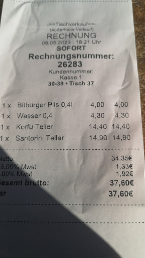 Aus irgendeinem Grund kann mir das Restaurant nicht so super gepflegt und aufgeräumt vor ... Meine Begleitung bestellte einen Aschenbecher ... Dieser war aus Plastik ( OK das sind fast alle) aber er hatte einen fetten Riss sprich war angebrochen ... Und das sah nicht ästhetisch aus ... Der Ouzo kann frei Haus ... Standard im 2 CL Gläschen... Die Weinschorle mussten wir diskutieren ... Sie wird normaler Weise im einer Karaffe serviert .. 0.25 l fifty fifty... Also 0.125l Wein ... Nicht genug um Geschmack aufzubauen es sei denn man mag es in dieser Verhältnismäßigkeit ... Naja .. die Lösung ... Eine kleine Flasche Wasser ein Glas Wein und ein extra Glas um das Verhältnis selber zu bestimmen ... Ist Erbsenzählerei JA aber es war unser Wunsch ... Das Essen war lecker ... Tatsächlich ein Grieche der KEIN Balsamico Essig kredenzt sondern ganz normalen Tafelessig ... Ist das jetzt für oder nicht edel genug ? Ich für meinen Teil finde diese Pseudo Balsamico Essig kredenzer lustig .. n gutes Olivenöl und normales Tafelessig ist für mich das beste Dressing ... Insgesamt war das Essen lecker .. und das Preis Leistungsverhältnis stimmte ... Wir saßen draußen .... Eine Kerze fehlte auf dem Tisch ... Das war ein wenig unromantisch wenn meine Begleitung nicht sooo unfassbar bezaubernd gewesen wäre ... Ich würde wieder hingehen wegen des Essens .. nicht wegen dem...