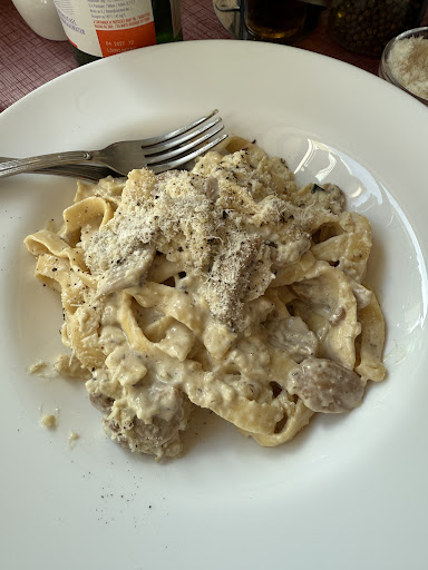 The restaurant was pleasant and for basic dishes seemed quite good. I ordered the tagliatelle with truffle and Steinpilze. That however was slightly on the bland side. I also could not taste any truffle. I had assumed there would be some fresh shavings of truffle at the table, but that presentation was also missing. I also saw no shavings of truffle on my pasta. It tasted decent, but that part was missing, which for €25 for a pasta dish, I did expect. I also did not get any presentation with a cheese Laib. The waiter was nice and that...