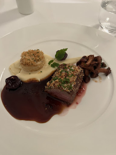 Der dritte Gang war Rehrücken mit einer gebratenen Selleriescheibe auf Selleriepüree. Dazu gebratene Pfifferlinge und Jus. War solide, aber in der Erwartung im Jacobs zu essen, doch zu wenig. Das Reh war rosé in der Mitte, aber nicht so zart, wie es hätte sein können. Pfifferlinge top. Die Selleriescheibe ... optisch schön, geschmacklich bestenfalls durschnittlich. Ich hätte stattdessen einen Löffel mehr Püree genommen.