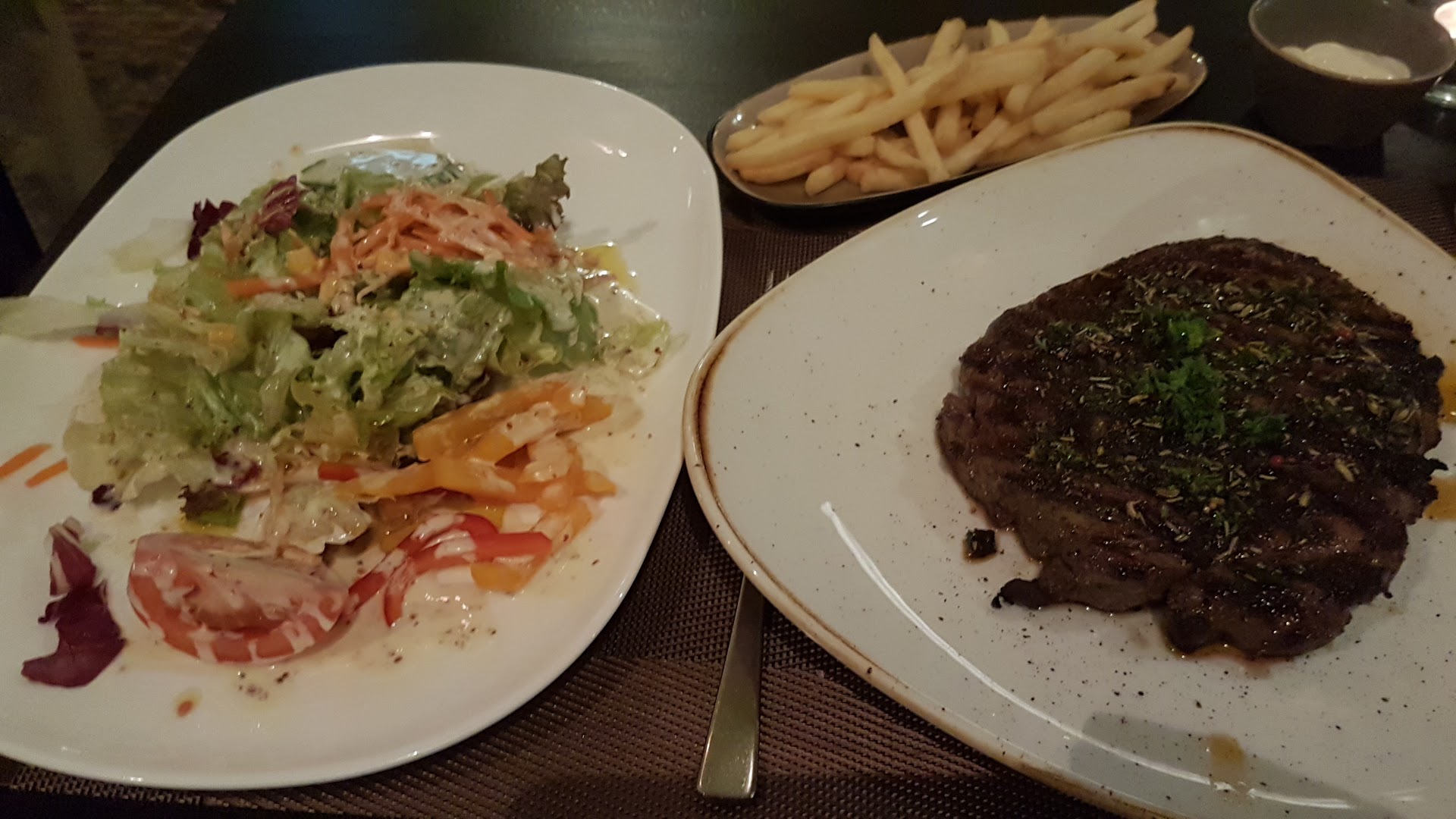 Als die Bestellung dann kam folgte erstaunlicherweise kein Kommentar des Kellners (mein Fleisch war übrigens extrem schmackhaft und perfekt für mich ;-)) allerdings folgte ein komplettes Wirrwarr an Beilagen. Hier hatte er wohl auch nur mit einem halben Ohr zugehört und einfach irgendwas ins Tablet eingetippt - sehr ärgerlich, da es wieder mit Wartezeiten verbunden war. Die Qualität der Beilagen (grade der Saucen) hat leider etwas abgenommen - diese werden wir nicht wieder bestellen. Als wir mit dem Essen fertig waren wurde zwar der Tisch abgeräumt, eine Frage zu weiteren Getränken oder einem Dessert kam leider nicht - sehr Schade!