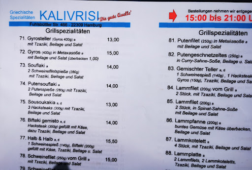 Read moreWir haben das Kalivrisi vor mittlerweile über 3 Jahren zufällig bei einem Spaziergang entdeckt. Von außen wirkt das Restaurant zunächst wie ein Imbiss - die Speisen haben hiermit jedoch wenig zu tun. Das Kalivrisi ist der beste Grieche, den ich in Hamburg kenne - und wir haben so einige getestet ;-). Es gibt eine kleine aber sehr feine Karte. Alle Gerichte werden frisch zubereitet - Fertigprodukte findet man hier nicht. An den Wochenenden gibt es meißt zusätzlich zur normalen Karte frischen Fisch. Hier empfiehlt es sich vorzubestellen, wenn man auch was abbekommen möchte ;-) Der Wirt und seine Familie sind super Gastgeber, man fühlt sich jederzeit willkommen. Wir sind zu Wiederholungstätern aus...