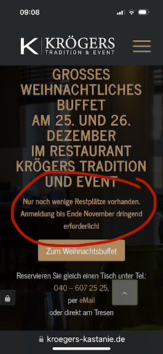 Auf der Suche nach einer schönen Location für unser diesjähriges Weihnachtsessen stieß ich auf die Kastanie. Laut Website werden Reservierungen fürs Weihnachtsbuffet am 25.+26.12. bis Ende November noch „gern entgegen genommen“. Also habe ich am 17.11. (also Mitte Nov.) reserviert und folgende Antwort gekriegt: Leider sind wir komplett ausgebucht. MfG. Keine Anrede, keine Entschuldigung, kein Bedauern, kein Alternativangebot. Auf meine Nachfrage, ob dies auch für den 26.12. gilt, kam eine noch pampigere Antwort und zwar gänzlich ohne Grußformel, noch nicht mal das unpersönliche MfG. Von jedem Chatbot hätte ich eine höflichere Antwort bekommen. Und das Beste: auf der Website steht weiterhin, dass Reservierungen gerne noch entgegen genommen werden!
