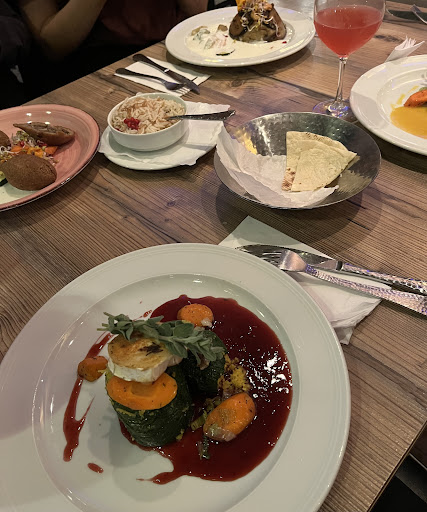I spent my evening with friends here and we had such a lovely time. The service was very welcoming and made suggestions for food. We shared the mazza and they were so yum! The different flavours and textures made it fun to try and everyone had their own favorite. One friend had lamb, another had falafel and one had eggplant in a yoghurt sauce. I had the courgettes in a blackberry-ginger sauce. Everyone of us was happy with their choice and it was so good. We really enjoyed the restaurant and the ambiente from inside is even prettier than the outside. At the end we got some ice cream to try, which was very nice of them. I recommend to come here because I will definitely come back.