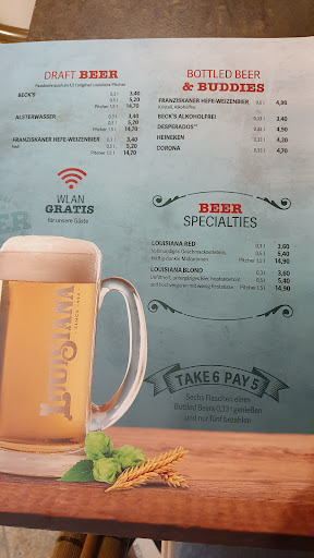 Unser Besuch mit 6 Pers. am Samstag den 28.09.19 nach netten 2 Stunden auf der Bowlingbahn sollte einen schönen Abschluss im Louisiana finden... dem war aber überhaupt nicht so und hat unsere, besonders meine, mehr als in den Keller gezogen! Die Dame vom Service war zügig am Tisch und nahm höflich unsere Getränkebestellung auf welche auch problemlos an den Tisch Nr. 22 gebracht wurden. Das Restaurant war in beiden Innen- und Außenbereichen gut besucht aber nicht überfüllt was dem Geräuschpegel zu gute gekommen ist. Wir bestellten uns Vor- und Hauptspeisen womit auch schon der nicht so schöne Teil des ganzen begann. Nach ca. knapp 40 Minuten fragten wir die Servicekraft wie es denn mit den Vorspeisen aussehe. Darauf hin gab es die Antwort das die Küche gut zu tun habe und nur eine von vier Vorspeisen also solche von uns angesagt worden ist. Nicht auszuschließen das es da einen Kommunikationsfehler gab aber eine Nachfrage, ob diese jetzt als Vorspeise kommen sollen oder ob wir diese noch haben möchten, gab es keine. Es handelte sich "nur" um 2 Brote mit Tomate Mozzarella, einem Gemischten Salat, Nachos überbacken und Süßkartoffelpommes. Nachdem aber der Nachbartisch welcher ca. 20min später gekommen ist bereits Hauptspeisen bekam ging ich nach 50 Minuten zur Dame am Empfang bat sie die Vorspeisen zu stornieren, just in diesem Moment kam auch schon die erste Vorspeise an den Tisch, Süßkartoffelpommes!Da ich Gastronomisch einen guten Blick besitze war es der Servicedame nicht mehr so angenehm an unseren Tisch zu erscheinen worauf sich ein netter Kollege zusätzlich mit unserem Tisch befasste und auf Nachfrage hin, ohne Probleme, die Nachos vom Bon herunter nahm und sich kompetent mehrmals entschuldigte.Weitere 10-15 Minuten servierten beide unsere Bestelltes es und leider auch einen kalten Pulled Pork Burger den er auf Wiederholung meines Anliegens auch sofort in die Küche zurück gingen ließ. Der neue Burger kam zügig aus der Küche zusätzlich mit dem Hinweiß einer Entschuldigung nach dem Essen aufs Haus.Somit sei zu sagen das die Burger, der Salat, die Brote und die Hähnchenspieße wirklich sehr lecker waren aber die Stimmung aufgrund der Vorgeschichte nicht mehr zu retten war. Während des Bezahlvorgangs war ebenfalls eine Unangenehme Stimmung zwischen Servicedame und uns als Gäste.
