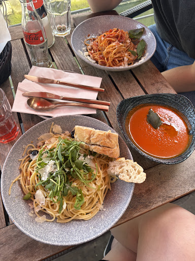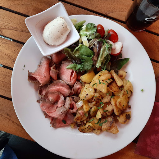 Not worth your hard earned money. We ordered an Apfelstrudel, a BBQ Burger, a hot chocolate and a Sprite. While we were waiting for the food we noticed that all guests around us had received a complimentary bread basket with dip. However, we had not. New customers arrived, were seated and were given some bread, servers were bustling around and making sure they did, while we were still breadless. Now my boyfriend and I are a younger couple in our early 20s and most other guests were noticeably older. Maybe they thought we were not guests that would tip well anyway and could be neglected. Not a pleasant thought, when I come to your restaurant, I expect good service no matter my age. After I asked if we could get some bread as well we were indeed served some but the fact that I had to ask for it spoiled the experience. The bread and dip were good. My hot chocolate. With 4.80€ not exactly cheap, therefore big though. However, very much not tasty. As a matter of fact, it had absolutely no taste to it. And the whipped cream, for which they demanded a whopping 70 Cents extra (excuse me?!) was nowhere to be seen either. The Sprite was a sad little 200ml glas bottle that went for the outrageous price of 3.10€. Now after all these very unsatisfying experiences I was really looking forward to my Apfelstrudel. While it was covered in delicious (but not much) vanilla sauce and came with a scoop of vanilla ice cream (tasty!) and a dollop of whipped cream (t'was okay) on the side, the pastry itself was disastrous. Only slightly warm, the filling made of apple slices with an unusual amount of spiky pieces and the pocket that contained it tasted very bready and unpleasant. I did expect a lot better for 7.90€. The BBQ Burger my boyfriend had ordered came with a side of fries and was, according to him, a good burger, with a good amount of sauce and 2 delicious bacon strips. However, it went for 15.90€ and you can find way better burgers at the Block House, so I wouldn't recommend coming for the burger. All in all we were very much not happy with the service and food provided and...