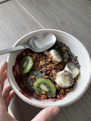 Als ich den Laden betrat war, wartete lediglich eine weitere Kundin vor mir. Hinter dem Tresen befanden sich hingegen drei Mitarbeiter, sodass auch in Anbetracht der Tatsache, dass frisch zubereitete Lebensmittel etwas länger brauchen, keine allzu lange Wartezeit zu befürchten schien. Dennoch vergingen knapp 10 Minuten, in denen der braungebrannte Surferboy intensiv mit der Kundin flirtete, bis ich meine Bestellung aufgeben konnte.
