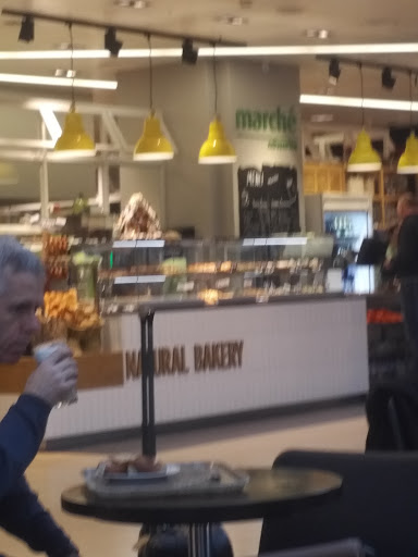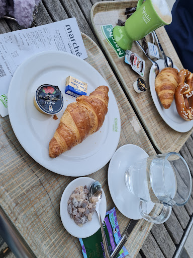 O cliente se serve nas diversas ilhas disponíveis — entradas, saladas, pratos principais, sobremesas e bebidas — todas no modelo self-service. Ao final, passa pelo caixa, onde o funcionário observa o prato e lança os valores, como em um restaurante do IKEA. A grande diferença é que, no IKEA, os preços dos itens estão claramente sinalizados antes de se servir, o que não acontece aqui no Marché Hamburg Airport.