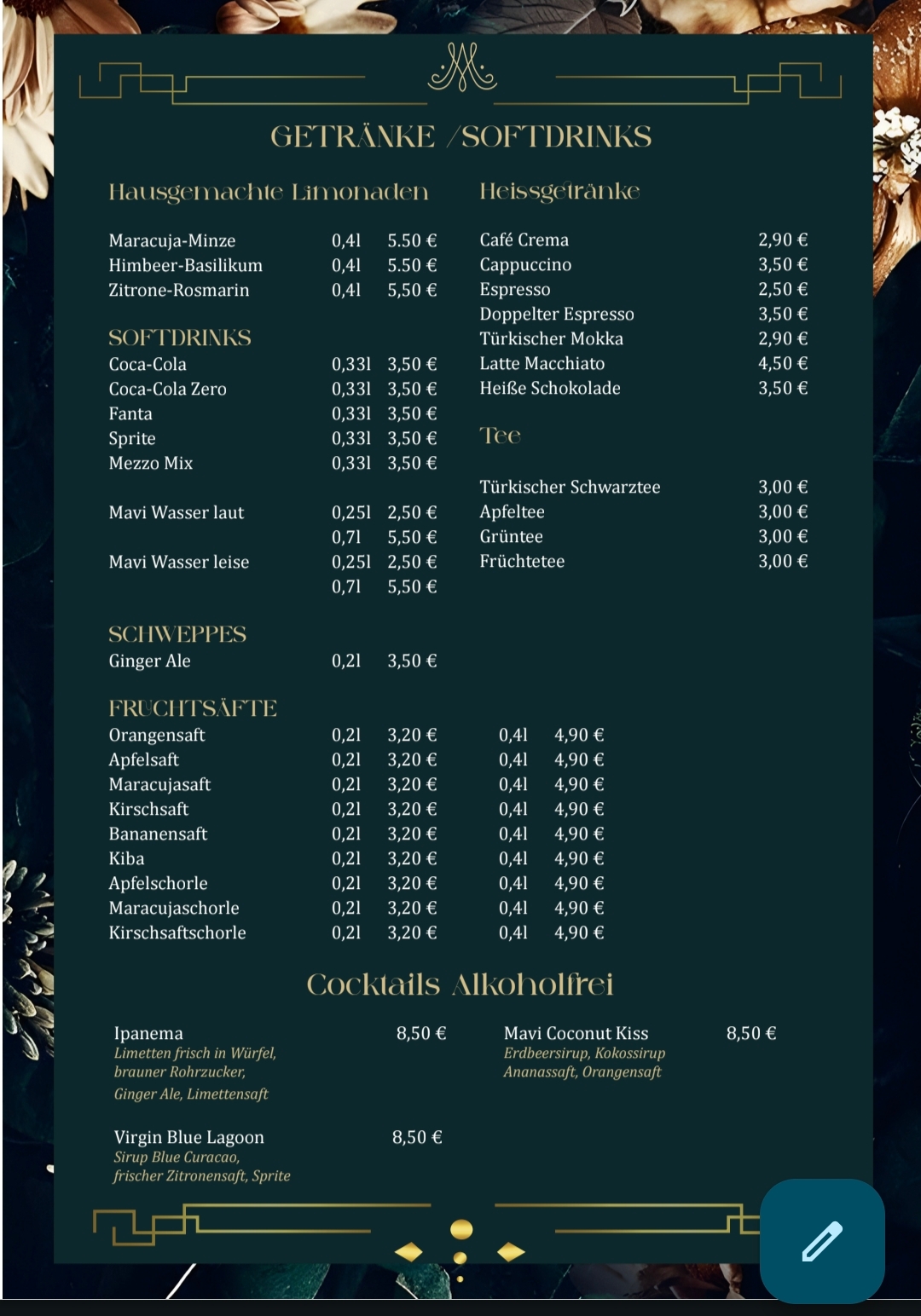 Wir waren kurz nach der Eröffnung im Mavi und es war eine toller Abend. Die Portionen waren großzügig und das Essen von hoher Qualität. Dazu waren die Speisen schön angerichtet. Die Speisekarte bietet eine fantastische Auswahl, insbesondere die Vorspeisen waren ein Highlight des Essens.