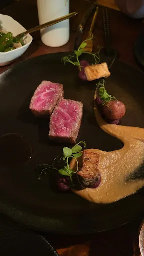 Everything was really phenomenal. From the starter to the middle course. The main course consisted of a t-bone steak, iberico fillet, black cod and squid. Both fish dishes were absolutely superb. Only the t-bone steak was cold and the meat unfortunately a bit tough. With the iberico, it would have been nice if he had brought us the duck, as it is a signature dish of the house.