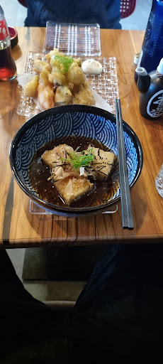 Casual outlet presenting Japanese plates & featuring dark wood interiors & colorful furnishings.