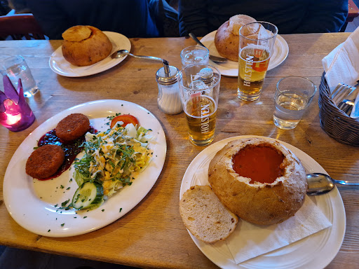 Read moreThe decoration is cute but the temperature was freezing inside making it uncomfortable. The music does not fit the theme. The gulasch soup was ok. The tomato soup was possibly the worst soup I've had. I would prefer the packets from Knorr to this. I asked the waitress if it was a cream of tomato soup. She said no but that it was creamy. Well it wasn't creamy at all, but spicy. My husband said it tasted like pasta sauce. The woman next to us also was complaining about her soup. Probably the same base as the gulasch soup. We had the fried camembert too as an appetizer but they served it with our meals. It was ok, but honestly it is impossible to screw up fried camembert. We asked the waitress where Holsten beer was from. She said northern Germany, followed by Nordrhein-Westfalen. Turns out it is from Altona, Hamburg. Maybe learn about the products sold. The faucet in the women's bathroom was broken and there were no paper towels. When it was time to pay, the card reader wasn't working. We tried 3...