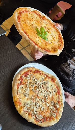 Vom Ambiente war ich nicht sehr beeindruckt. Dafür vom Service. Wir wurden direkt nach dem Eintreten begrüßt und nach unserem Begehr gefragt. Ob wir hier essen möchten oder lieber etwas zum Mitnehmen haben wollen. Nachdem wir von unserer Buchung gesprochen haben, wurden wir direkt zum Tisch geleitet. Vom dem, in etlichen Vorpost's gerühmten, Bruschetta waren auch wir begeistert. Im Nachhinein betrachtet, hätte ich die Vorspeise weglassen sollen. 🫣 Meine Frau aß Nudeln mit geräuchertem Lachs (das Gericht wurde als eines der Tagesgerichte angepriesen) und war durchaus rundherum zufrieden. Ich nahm eine Pizzolo mit Mozzarella, Bruschetta, Ei und Pilzen. Das ist zum einen eine, in dem Lokal üblich, sehr große Pizza, die mit gefühlt doppeltem Belag, zum Schluss noch mit einem zweiten Pizzaboden zugedeckt und dann gebacken wird. Im Endeffekt zwei Pizzen zusammen geklappt oder anders gesagt 2x Calzone von der Menge her. Ich habe es, vielleicht bedingt durch die Vorspeise, nicht geschafft. Der Kellner fragte auch beim abräumen direkt, ob er den Rest einpacken soll. Die Preise waren auch sehr vernünftig in Anbetracht der großen Portionen.