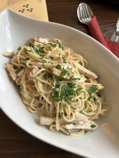 🔸The restaurant has a vast menu of items to choose from: pastas, suppe, pizzas, steaks etc. 🔸There is ample space to sit. 🔸The only reason I'm giving it a 4-star and not a 5-star is because the taste of the pasta. The chicken was really good but I felt the taste of the pasta was a bit bland for my liking, although still really good. I would definitely come and try something new. 🔸I got my food surprisingly very quickly! I think about 5-6 mins which I’m not sure is a good or bad thing 😅 🔸The price is reasonable. I ordered spaghetti with white sauce and chicken and it was definitely fulfilling for a single person. If you're not that hungry, I would recommend getting only 1 pasta to split with your friends and order something else later. 🔸The staff is super friendly and welcoming! I had the owner (not sure) come and ask me if the food was alright and if there is anything else I need. 🔸The washrooms are neat and clean.