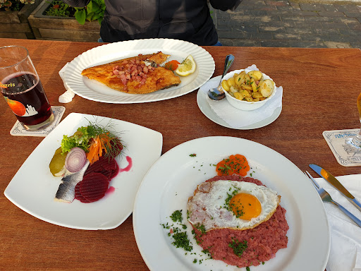 DIE Bremer genießen Es ist eh her bekannt, dass sich Hamburger und Bremer in allen Themen und Situationen "fighten", wer es denn nun besser kennt oder kann. Das ist bei "Ahrberg" nicht relevant: wir (5 Erw.) kamen spontan in das Treppenviertel, um vor Heimreise uns noch die Beine zu vertreten und etwas zu Essen. In Sichtweite der genutzten Busrundlinie Blankenese gelegen, hat uns die Lage vom Ahrberg sofort angesprochen. Die erhobene Lage um direkt auf die Elbe schauen zu können und die herrlichen großen Bäume die angenehmen Schatten spenden waren die ausschlaggebenden ersten "Häkchen" die uns veranlassten hier einen Platz zu ergattern. Schon der freundliche Empfang und Umgang vom Routinier am Tisch, Bernd, ließ uns eine tolle Mittagszeit erhoffen. Die Saison- sowie die aktuell geführte Hauptkarte hat so manche Leckerei und nicht nur Mainstream zu bieten. So fanden wir schnell und sicher, auch mit fachlicher Nachfrage beim Routinier am Tisch unsere jeweiligen Menüs mit kleinen Anpassungen, damit die Voraussetzungen gegeben waren, dass es allen ein Genuss werden könnte. Wenn die Küche nun die Professionalität von Bernd weiterführt, ja wenn... Wir wurden nicht enttäuscht!!!! Ob Maischolle, welche in 2 Gängen serviert wurde (WO bekommt man das noch???) oder Schollenfilet im Eimantel sowie Grützwurst, welches und das sage ich als Ostwestfale, der noch "Schlachtefeste" kennt war unfassbar gut. Fein abgestimmt mit Apfel und Rosinen. Herrlich!!!! Hier zeigt sich, dass sich das Haus ein erstklassiges Netzwerk an Zulieferern erarbeitet hat. Lob an den Schlachter. Das ist noch "Handwerkskunst". Die frischen Erbbeeren aus dem alten Land, welche ja bekannterweise auf den jenseitigen Ufern der Elbe liegen sowie der eigenen Rhabarberkuchen waren ebenso ohne Tadel und ein "runder" Abschluss. Der Spaziergang am Elbeufer war dringend nötig...
