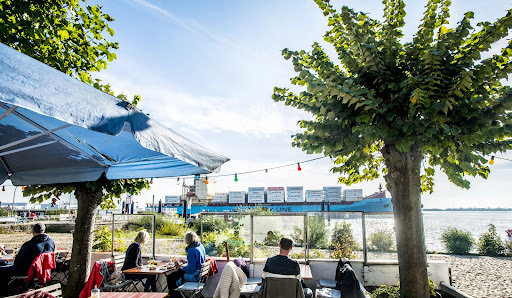 Ein wunderbarer, dicker Baum beschattet eine wunderbare Terrasse, auf der man einen wunderbaren Blick auf die Elbe und alle Schiffe hat, die vorbei kommen.