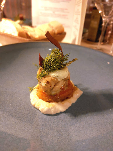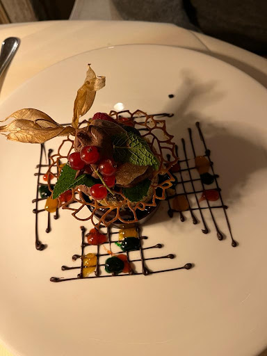 Read moreGreat menu! We booked the Rindchen wine pairings along with the menu. Each course was generally very flavorful, and the presentation was the best we've seen so far, so many handmade and artistic details! The veal knuckle was done perfectly and was delicious with the truffle on top, and the dessert was very good (even served with a culinary compliment from the kitchen beforehand)! I had to take a star off though, because the temperature was borderline too cold, we found the atmosphere, in general, a bit too stiff for our taste, and the wine portions were not very generous and no top-ups considering the fairly high price we paid (28€ pP). Geared toward a bit older crowd. Nice decorations and a fireplace screen video..... Reservations...