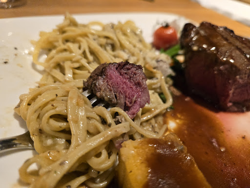 Es trat eine stets nette und sehr sympathische Mitarbeiterin mit dem Namen Nina an uns heran. Als ich nach Tagesgerichte fragte, sprudelte es nur so aus ihr heraus. Sie erklärte uns ganz genau, welche Tagesgerichte neben der eigentlichen Speisekarte angeboten wurden. Es handelte sich um ein Fisch, Fleisch und Pastagericht für jeweils 19,90 Euro. Auch würde ein Salat für 19,90 Euro angeboten. Wir entschieden uns für 3 Gerichte. Fleisch (Rumpsteak mit Rosmarin-Kartoffeln) etc., Zanderfilet mit Safransauce mit einer Art Risotto und Pasta Bolognese Art entweder mit Hack oder Lachs. Wir entschieden uns für die Hackfleisch Variante.
