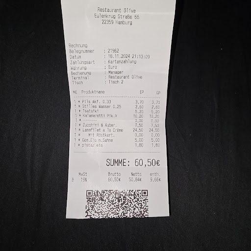 Read moreDie kürzlich hier getätigten negativen Bewertungen zur 'Olive' passen überhaupt nicht! Wir gehen seit langem mehrmals im Monat an unterschiedlichen Wochentagen, allein oder mit unseren Freunden in dieses freundliche Restaurant in Volksdorf, und sind IMMER sehr zufrieden gewesen! Das Essen ist sehr gut gekocht, lecker und stimmig gewürzt. Portionen sind so reichlich bemessen das wir diese kaum schaffen. Egal was man in Fisch o. Fleisch als Vorspeise oder Hauptgericht bestellt, es schmeckt uns allen immer sehr gut! Eine Nachspeise obenauf ist uns bisher unmöglich gewesen, da von Vor- und Hauptgang immer sehr satt. Qualitativ bemerkenswert, das Preis-Leistungsverhältnis ist durchaus stimmig. Übrigens backt man hier tatsächlich fast täglich sein eigenes fluffiges Brot mit leckerer Kruste! Wo gibt es sowas noch in einem so kleinen Restaurant?! Es werden einem Sonderwünsche und Kombinationen nach Möglichkeit erfüllt, auch wenn nicht auf der Karte. Natürlich ist ein pur veganes Essen hier kaum machbar, eine leckere vegetarische Option kann man hier selbstverständlich bekommen. Und wenn spät am Abend etwas ausverkauft ist, dann wird hier offenbar nicht mal schnell was aus dem Froster geholt und in die Pfanne gehauen. Wenn einem ein Gericht, in einem guten Restaurant, nicht mehr angeboten werden kann, so kann der Gast wohl sicher sein das Ware frisch eingekauft und auch frisch am gleichen Tag zubereitet wird. Was aus ist dann eben aus, Alternativen gibt's immer in der reichhaltigen Karte. Das griechisch, russisch(!) und ukrainische(!) Personal und die Inhaberfamilie sind sehr nett, sehr freundlich und uns gegenüber immer äußerst liebenswürdig. Wir sind gerne hier und kommen immer gerne wieder. Man sieht durchaus andere Gäste häufiger hier.....kann also kein schlechtes Zeichen für ein gutes Restaurant sein! Die Meckerer dürfen bitte und gerne die Olive meiden, so haben wir wenigstens am Wochenende eine Chance auf einen Tisch, denn Reservierung zu den Hauptzeiten ist sinnvoll, gerade mit mehreren...