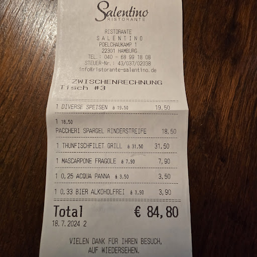Ein alkoholfreies Bier wurde mit 3,90 € berechnet. Das Wasser mit 0,25 l wurde mit 3,50 € berechnet.