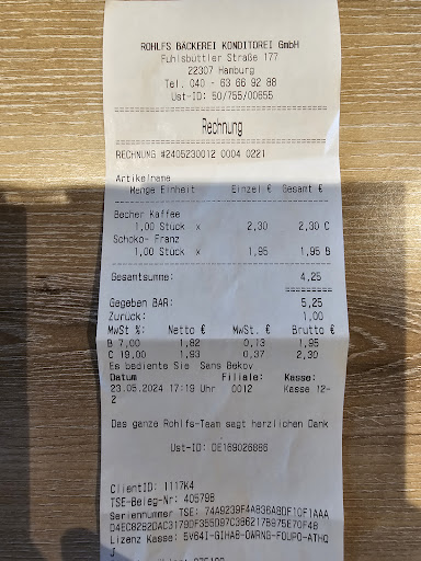 Read moreAm 23.05.24 kaufte ich hier ein Franzbrötchen mit Schokoladenstreusel. Es sah optisch verunglückt aus. Der Preis: 1,95 €. Dazu bestellte ich einen kleinen Becher Kaffee: 2,30 €. " Kartenzahlung vorerst nicht möglich", stand auf einem Zettel geschrieben. Leider war für mich ,als Kunden, der Gesamtpreis auf dem Monitor am Kassenterminal nicht ablesbar, da die Größe der Zahlen weniger als 1 cm war und ich davon ca. 80 cm entfernt stand. Der Gesamtpreis von 4,25 € wurde mit 5,25 € beglichen, was auch auf dem Kassenbon vermerkt ist. Leider vergaß (?) der junge Mitarbeiter, mir das Wechselgeld herauszugeben. Das geschah erst nach Anmahnung. Interessant war für mich auch, wie der Zahlungsverkehr ablief: Der zu zahlende Betrag wurde an einem Terminal eingegeben. Der Geldbetrag wurde in eine andere Kasse hineingelegt. Das Wechselgeld sollte aus einem Plastikbecher entnommen werden. Leider war das nicht erfolgreich. Dann wurde das Wechselgeld (Rückgeld) aus einer...