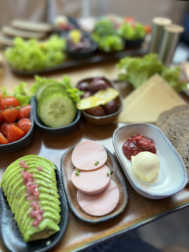 Das vegane Frühstück hat über 15€ gekostet (das war das teuerste aller Frühstücksangebote, ich verstehe nicht warum). Bekommen hat man dafür ein paar Datteltomaten, 2 Salatblätter, ca. 20g Gurke, ein paar Oliven, 2 halbe Scheiben veganen Käse, 3 winzige Scheiben vegane Wurst, ein paar Scheiben von einer halben Avocado, etwas Margarine und einen Klecks Marmelade. Dazu dann 3 Scheiben vom hausgemachten glutenfreien Ketobrot. Allerdings waren die Scheiben so winzig klein und trocken und haben leider absolut nicht zum satt-werden beigetragen. Man war danach noch hungriger als vorher. Das hat mich etwas traurig gemacht, denn alles was dort angerichtet war, sah mir eher lieblos zusammengestellt aus. Ein veganes Frühstück kann so viel mehr bieten als ein bisschen Grünzeug. Es war auch nichts originelles bei, wo man sich sagt: oh, da lohnt sich doch der stolze Preis. Ich habe mir noch einen Joghurt mit glutenfreiem Brownie dazu bestellt. Es war hübsch angerichtet, doch auch hier habe ich kein bisschen Raffinesse herausgeschmeckt. Es war einfach nur etwas Schokokuchen mit Naturjoghurt. Weil ich nach diesen Gerichten immer noch nicht satt war (ich bin eine zierliche Person und esse eigentlich nicht viel, aber das hat alles kalorisch wohl nicht so viel zu bieten gehabt), habe ich mir noch ein Stück des hausgemachten Käsekuchens bestellt. Auch hier musste ich enttäuscht werden - die Creme schmeckte langweilig - da war nichts besonderes herauszuschmecken, der Boden wässrig und leicht bitter. Das kleine Stück hat fast 6€ gekostet. Ich wollte gern einen Ingwertee haben, der wurde mit Minze angeboten. Beim bestellen machte ich deutlich, dass ich Minze nicht so mag, mir wurde hier jedoch nicht deutlich gemacht, dass man die Minze auch weglassen kann (ich dachte, das kommt dann in einem Beutel oder so). Aber es war ein frisch zubereiteter Tee mit losen Pfefferminzblättern, die man beim zubereiten ruhig hätte weglassen können. Vielleicht war das etwas zu viel verlangt, denn alle Tische waren schon morgens um 10Uhr belegt und alle Gäste die spontan kamen, wurden wieder weggeschickt, weil alle Plätze durchgehend reserviert waren. Die Kellnerin machte auch den Eindruck, dass sie uns gern wieder schnell loswerden wollte. Wir hatten eine Frage, die beantwortete sie im weggehen zur Hälfte, kam dann irgendwann wieder und wir haben die restliche Hälfte der Antwort bekommen. Das fanden wir schon etwas unhöflich.