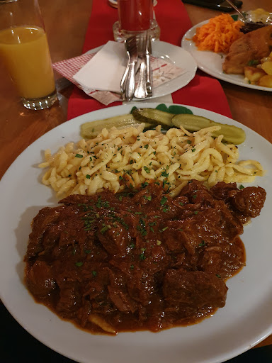 Wir hatten Schnitzel und Gulasch. Was soll ich sagen? Das Schnitzel war ein Riesengerät, frisch geklopft und zart. Dazu kamen ausgezeichnete Bratkartoffeln - ohne Speck oder anderen Schnick Schnack - und ein Möhrensalat mit Ingwer der mich schlichtweg begeistert hat. Alle Haupt- und Nebendarsteller auf dem Teller waren perfekt - kein blödsinniges Salatbouquet, keine Spielerein. Das Gulasch war hervorragend. Gutes Fleisch an einer kräftigen Mischung, pfeffrig rauchiger Noten. Dazu klassische Spätzle, einfach in Butter gebraten - 1a! Ein Zehntel Abzug bekommt die Gulaschsoße: etwas zu viel Salz. Dafür schmeckt dann das Bier wieder besser :)