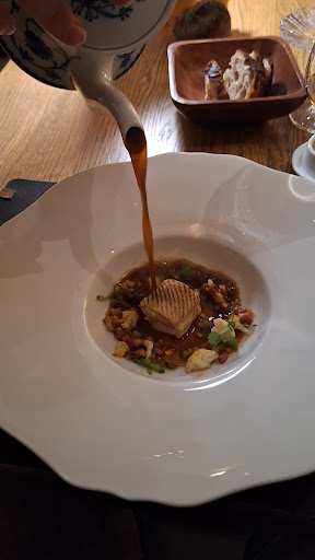 Read moreSchönes Ambiente, ambitionierte Abendkarte - Erwartungen nicht ganz erfüllt Wenn für ein 5-Gang-Menü 116 € aufgerufen werden, der wohl angestrebte Stern also fast schon eingepreist ist, muss eigentlich alles passen. Einige Gerichte hatten phänomenale Aromenkombimationen: So ist mir das „Fischbrötchen deluxe“ in bester Erinnerung geblieben. Ebenso eine zur Stubenkükenbrust (die mit „Panko-Streusel“ selbst etwas fad war) separat gereichte Morchelsoße mit extrem reichhaltiger Keulenfleisch-„Resteverwertung“ (Zitat des Chefs). Dass das Ganze manchmal mehr ist als die Summe der Einzelteile, ergab sich auch beim Dessert, wo der Tonkajoghurtschaum die Fruchtaromen wunderbar bereicherte und das Fehlen eines schokoladigen Elements (aus Sicht eines Schokoholics wundersamer Weise) vollständig kompensierte. Freundlich war einerseits, dass die „Einstimmung“ in Bezug auf das frittierte Backfischstückchen (Achtung sehr heiß: Wenn man es im Überschwang des Anfangsappetits im Ganzen zu zu sich nimmt, verbrennt man sich leicht gleich zu Beginn des Abends den Gaumen…) mit entsprechenden Hinweis der forsch-zugewandten Servicekraft auch der dritten Person zuteil wurde, die à la Carte aß. Anderseits sollte ein Amuse Geule doch für alle Gäste in der Preisklasse Standard sein. Da die Anfangsgänge des Menüs sehr kleine Portionen sind, könnte man sich auch vorstellen, von dem hervorragenden Knäckebrot mit Nussbutter länger/mehr zu erhalten. Am Ende stellt sich natürlich auch so ein angenehmes Sättigungsgefühl ein, zu dem wohl auch das Naschen an den leckeren und reichlichen Chips der dritten Person betrug. Der zugehörige Fish (Heilbutt) war war in der Pannade aber leider etwas breiig, was bereits beim entsprechenden Amuse Geule auffiel. Schade. Besonders schade aber auch, dass der Hinweis darauf (auf die obligatorische Nachfrage, ob alles recht sei), vollständig ignoriert wurde… Die Weinbegleitung war klasse und ebenso fair bepreist wie das Karaffen-Wasser. Die Auswahl an ansprechenden, menübegleitenden alkoholfreien Alternativen ist überschaubar. Einen koffeinfreien Espresso gibt es nicht - „noch“, wie uns mitgeteilt wurde. Es ist also in mancher Hinsicht noch etwas...