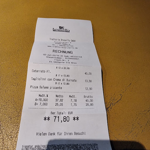 Read moreLieber Dirk, toll gemacht! Über 15 Jahre Trattoria Brunello, natürlich gewürdigt durch ein rauschendes Fest. Die Gäste mögen ihr Brunello und haben in höchsten Tönen geschwärmt. Oder wie es ein Poppenbütteler so schön sagte: wo soll man den hingehen, wenn man gut essen will-wenn es nicht immer das Stocks sein soll! 15 Jahre liebe zu Italien und seiner Küche, damit bist Du ein Jahr älter als die Alsterjungs 😂 Hut ab außerdem vor der Reservierungrate, selten eine Trattoria gesehen die tagtäglich, so gebucht ist. Da werden wir uns wohl angewöhnen müssen, vorher durchzuklingeln. Ein praktischer Umstand das der Gast, nach einem fröhlichen Abend, gleich in die S-Bahn fallen kann, die hält zum Glück fast vor der Tür 🤪