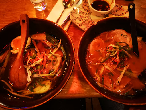 Wir hatten Ramen Tonkotsu, Pho Bo Ap Chao, Schwein Gyoza sowie Tra Chanh Leo und Sua Chua Cafe. Wir wurden beide satt, die Ramenbrühe ist reich an Geschmack.