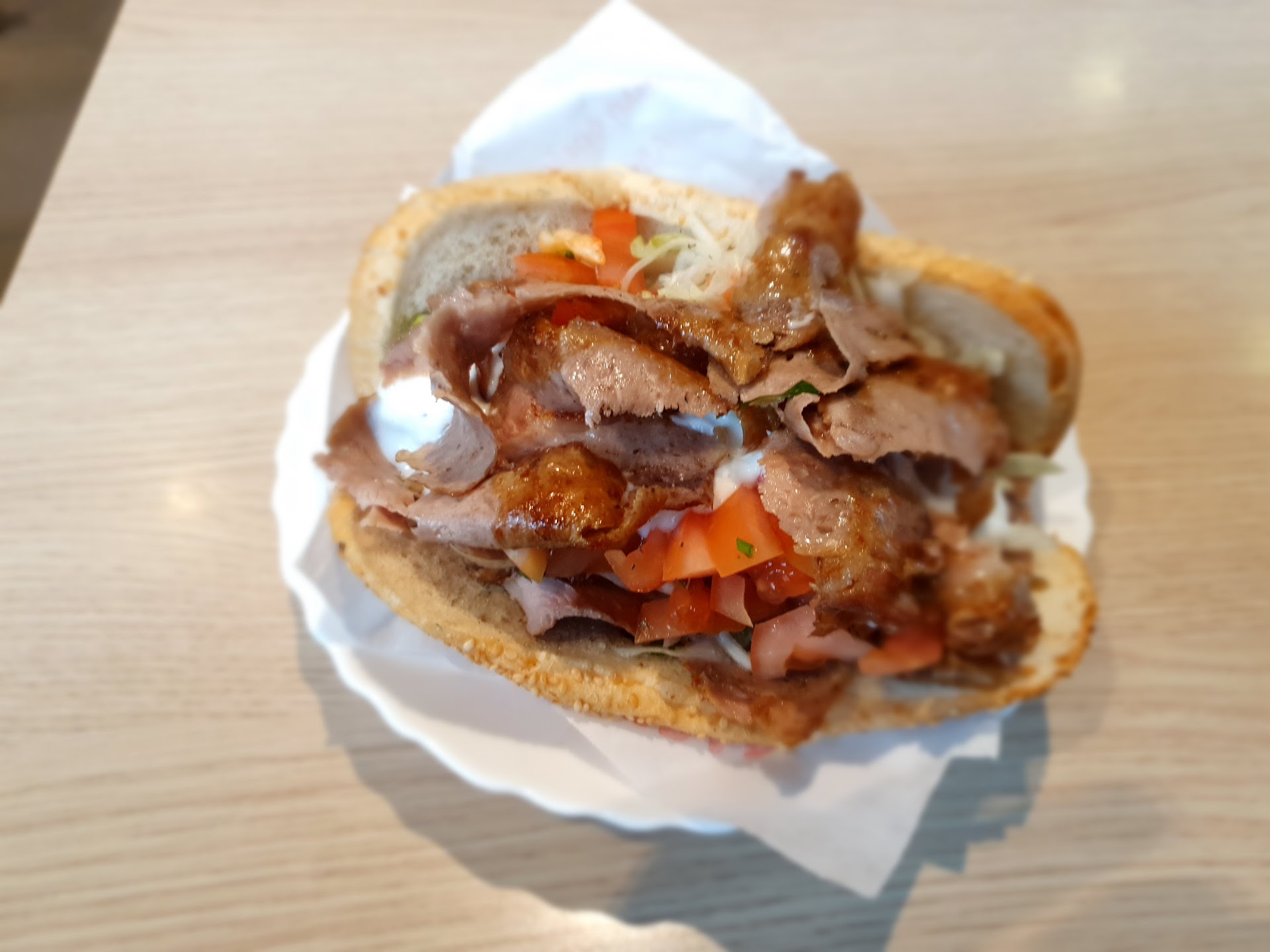 Döner nach meinem Geschmack hätte das Fleisch länger braten können. Das Brot war überhaupt nicht knusprig und trocken-fluffig. Das Gemüse war sehr frisch und die Soßen war in Ordnung.