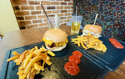 Read moreFrom the outside the place looks really cool with all the different colors and squares. On the inside it looks even cooler and has posters all over the ceiling. The bathrooms were also really cool looking and we'll decorated. Their was a ton of burger options to choose from, all original ideas, and all of them COME WITH FRIES!!! I had the HH- towers Burger and it was delicious and also massive! Pics attached. I would highly recommend this place. The only issue was the fries were just a little bit cold, other than that everything...