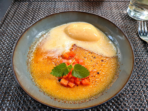 Wir haben einen Tisch für 4 Personen für 18 Uhr reserviert. Wir waren pünktlich und wurden freundlich begrüßt, bekamen einen Tisch im Außenbereich und wurden bereits zu Beginn darauf aufmerksam gemacht, dass der Tisch ab 20:30 Uhr nochmal vergeben ist. Das war für uns kein Problem, da wir zwar die 3 Gänge Essen wollten, aber davon ausgingen, dass dies in 2,5 Std. machbar ist, ohne schlingen zu müssen. Die erste Getränkerunde kam auch sehr flott und wir haben direkt die 3 Gänge bestellt, worauf die Bedienung noch meinte dann kann sich die Küche gut vorbereiten. Bei der Bewertung des Essens gehe ich nachfolgend hauptsächlich auf meine Bestellung ein. Vor der Vorspeise wurde noch Brot mit Dip geliefert. Gang 1 (Thunfisch Tataki): Sehr leckere Vorspeise. Insbesondere die nussige Ponzu hat mir sehr gut zum Thunfisch geschmeckt. Portionsgröße für eine Vorspeise gut. Vorspeise = 5 Punkte. Die leeren Teller der Vorspeise wurden gegen 19 Uhr abgeräumt und es wurde gefragt, ob direkt die Hauptspeise geliefert werden soll oder wir noch warten wollen; auch im Hinblick auf die erneute Tischvergabe haben wir mitgeteilt, direkt zu Gang 2 übergehen zu wollen. Bis dahin war; bis auf das längere warten auf ein bestelltes Radler und ein ab und an aufkommender "Biotonnengeruch" die Welt noch in Ordnung. Aber zwischen dem Abräumen von Gang 1 und dem Servieren von Gang 2 ist ziemlich genau eine Stunde vergangen. Das zwischenzeitliche Nachfragen bei der freundlichen Bedienung wurde mit einem "ich hab das direkt an die Küche weitergegeben" beantwortet. Gang 2 (Maishähnchen): lauwarm, Fleisch teilweise fettig, Portion hätte für mich etwas größer sein können, ansonsten ganz in Ordnung (3 Punkte). Gang 3 (Cremé Brulée): Sehr lecker. Aber inzwischen waren wir zeitlich natürlich längst über die 20:30 Uhr drüber. Das war wahrscheinlich auch der Grund warum die Kellnerin zwar noch regelmäßig an unserem Tisch vorbeigelaufen ist, aber nicht mehr nach Getränken gefragt hat. Ok wir hätten uns natürlich auch aktiv melden können, aber da die nächsten Gäste natürlich inzwischen schon ohne Tisch wartend im Eingangsbereich standen, wollten wir es jetzt auch nicht weiter hinauszögern. Die Kellnerin hat uns beim Abräumen dann freundlich darauf aufmerksam gemacht, dass sie dann auch schon die Rechnung bringen müsse. War absolut ok, weil wir ja über die Anschlussvergabe informiert waren. Aufgrund der Wartezeit wurde uns ein Teil der Getränke nicht berechnet. Insgesamt würde ich das Essen mit 4 Punkten bewerten, der Service ist schwierig zu bewerten, weil zwar alle sehr nett waren aber die Wartezeit auf den Hauptgang unmöglich war. Da dies eingesehen wurde und bei der Rechnung auch entsprechende Kulanz gewährt wurde will ich aber auf der anderen Seite nicht übertrieben abziehen. Naja, insgesamt halte ich 3 Punkte für fair. An einem guten Abend sind sicher auch 4 Punkte drin, aber das werde ich nicht testen, dafür gibt es zu viele leckere...