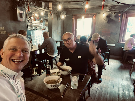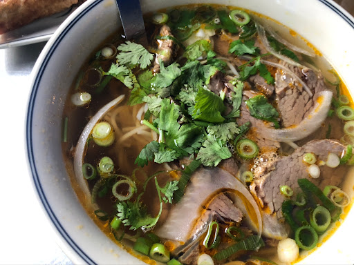 One nice extra is the sun, which shines on the outdoor tables from noon until 15:00. In the evening the sun reflects in the mighty windows of the exhibition hall. So, you still can wear your nice sunglasses when you slurp your Phở. Which is a good thing.