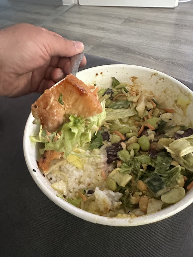 Die Teriyaki-Lachs-Bowl war eine Katastrophe: Ein trauriges, altes, ausgetrocknetes Stück Lachs, das nicht frisch war und sogar das Risiko einer Lebensmittelvergiftung barg.