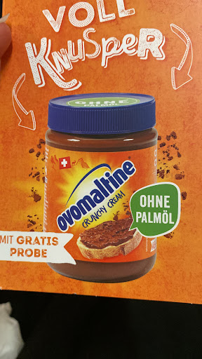 Sein netter Mitarbeiter wollte mir zwei Tester vom crunchy cream ovomaltine mitgeben. Worauf der Chef mir nur einen gab mit dem Argument nicht dick zu werden, nach dem er seinen Mitarbeiter irgendwas hinterher genuschelt hat.