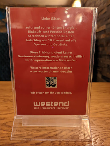 Auch wenn wir eingeladen waren sind die Preise völlig in Ordnung und ich kann die Kritik anderer diesbezüglich, gerade in der heutigen Zeit, nicht nachvollziehen. Beschwert euch bei der Politik und nicht bei den Gastronomen!