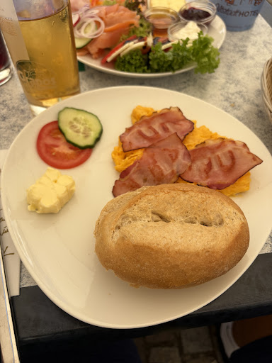 Read moreEine solide Frühstücksoption für alle, die garantiert gut essen möchten. Das Café bietet Sitzplätze drinnen und draußen, aber unsere Gruppe entschied sich für den Außenbereich, um Hammelburg zu sehen und zu erleben, und hatte einen schönen Blick auf den Platz. Ich bestellte ein Brötchen mit Butterspeck und Rührei. Es war ein gutes, klassisches Gericht und ein solides Frühstück. Der Speck schmeckte angenehm geräuchert und war leicht gesalzen, das Rührei war käsig und hatte eine angenehme Konsistenz. Die anderen beiden aus meiner Gruppe bestellten das Frühstück für zwei Personen. Es enthielt Lachs, Schinken, Honig, andere Aufstriche und Brötchen, die das Frühstück abrundeten. Sie sagten, es sei gut und das Fleisch und die Aufstriche hätten sehr gut gewürzt. Der einzige Grund, warum ich das nicht höher bewerten sollte, ist, dass es nicht viel zu bieten hat, aber das heißt nicht, dass es kein gutes Frühstück ist. Wenn Sie ein einfaches, aber gutes Frühstück suchen, sind Sie...