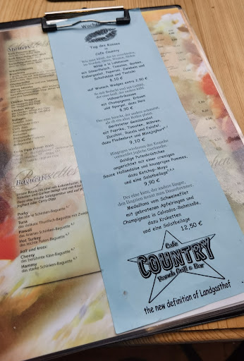 Read moreEinen Stern muss ich vergeben um eine Bewertung zu schreiben. Dieser ist für den jungen Mann der uns freundlich empfangen und bedient hat. Alles andere verdient keinen Stern. Das was abgeliefert wurde ist unterirdisch schlecht gewesen. Nachdem wir mehr als eine Stunde auf zwei Burger und eine Portion Süßkartoffeln Pommes gewartet haben wurde ein Chicken Burger mit verbranntem Fleisch geliefert, der andere Burger der angepriesen wurde mit Gorgonzola und Birne war ebenfalls nicht annähernd einer Restaurant Küche würdig, nicht mal in einer schlechten Kantine würde die Birne mit Kerngehäuse und der Gorgonzola als pappiges Eck aus der Packung serviert werden. Sogar die Pommes waren nicht essbar, dunkel und zugleich pappig, ausgesehen hat es als hätte man die Reste des Tages noch einmal aufgewärmt. Sicherlich steht in dieser Küche kein Koch sondern jemand der will aber nicht kann. Wir haben das Essen zurück gehen lassen, haben unsere Getränke gezahlt und sind zu Thunderbike ins Roadhouse gefahren. Dort war das Essen absolut lecker und kam nach wenigen Minuten auf den Tisch. Darum, klare Empfehlung die Straße etwas weiter zu fahren und niemals ins Cafe Country zu gehen. Übrigens, während der Wartezeit haben sich noch mehrere andere Gäste über das Essen beschwert Dem jungen Mann der uns bediente kann ich auch nur empfehlen sich anderweitig zu orientieren, er hat die Kritik die er heute Abend einstecken musste...