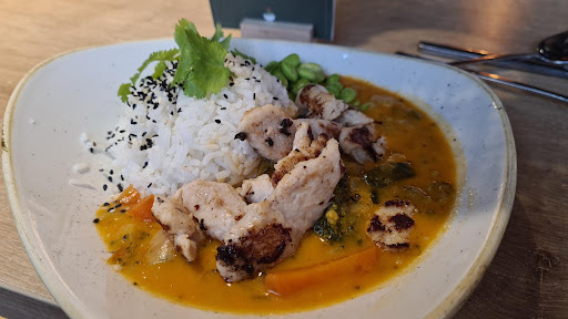 Read moreBei Dean & David werden hochwertige Bio-Lebebsmittel verarbeitet, zum Dort-Essen, zum Mitnehmen und zum Ausliefern verarbeitet. Es gibt Bowls, Salate, Sandwiches und im kleinen Umfang Currys und Suppen. Der Standort in Hanau bietet täglich ein Curry an, das man aber in verschiedenen Versionen essen kann. Ich persönlich würde empfehlen dass Dean & David mehr warme Mahlzeiten anbietet. Leider hat der Standort kein WC, weil er zum Forum Hanau gehört, wenn er auch nicht im Gebäude drin ist. Das Personal ist sehr nett und hilfsbereit. Das Geschäft ist sehr modern, msn bekommt ein Gerät mit den den Tisch welches ein akustisches Signal von dich gibt, wenn das Essen fertig ist. Generell bietet Dean & David Mehrweg Essensbehälter an, auch für Lieferungen, sofern man die Dean & David App nutzt. Es gibt auch ein Bonusprgogramm. Ferner macht Dean & David bei Weight Watchers mit, zumindest war es so als ich noch bei Weight...