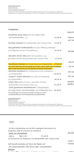Wir haben offen und persönlich Kritik geäußert und wir wurden nur belächelt und als blöd dargestellt. Die Karte die Sie geschrieben haben zeigt keine Auswahlmöglichkeit beim Frankfurter Schnitzel an (siehe Bild in der Rezension als Screenshot aus der Speisekarte Ihrer Website). Ich habe Ihnen für das Essen 4 Sterne gegeben aber für das Gesamte nur einen Stern weil der Service und die Kritikfähigkeit mehr als fragwürdig war.