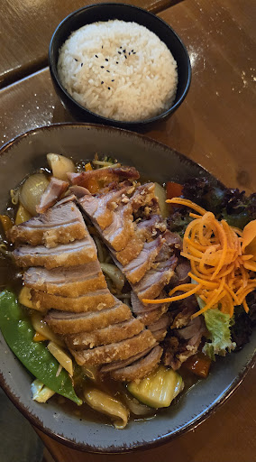 Guter Service, tolles Ambiente, Essen aber nur "okay". Der Kellner war super freundlich und kommunikativ. Er hat es geschafft eine angenehme Atmosphäre zu schaffen. Das Ambiente war auch wirklich wunderschön in dem Laden. Das haben die Besitzer echt gut hingekriegt! Leider war es geschmacklich enttäuschend. Die Portionen war auch eher klein. Ich hatte danach irgendwie noch Hunger. Der "Hunger" kam aber eher davon, dass ich nicht richtig zufriedengestellt war. Das Curry war (so kann ich es am besten beschreiben) etwas geschmacksneutral und viel zu sehr dem europäischen Gaumen angepasst. Sprich - überhaupt nicht scharf und einfach auch nicht würzig oder aromatisch. Leider wurde auch nur ziemlich das langweiliges bzw billigstes Gemüse genutzt, was sehr einseitig war (nicht mal Brokkoli). Es war einfach auch zu wenig Gemüse für meinen Geschmack. Gut war aber die Konstistenz und Frische des Gemüses. Der Reis war auch gut gekocht. Die größte Enttäuschung war der Tofu. Der hat leider nach nichts geschmeckt. Das hat geschmeckt wie ein Tofu, der von jemandem zubereitet wurde, der sagt er mag keinen Tofu, weil der nach nix schmeckt. So war der Tofu auch. Wässrig und enttäuschend. Ich würde schon wiederkommen und nochmal was Anderes ausprobieren. Vielleicht war es auch der direkte Vergleich zum ZEN, zu dem ich eigentlich gehen wollte, weshalb ich geschmacklich eher enttäuscht war. Der Laden war aber auch echt noch relativ neu als ich da war und vielleicht hat sich mittlerweile etwas verändert. Außerdem waren das Ambiente und der Service...