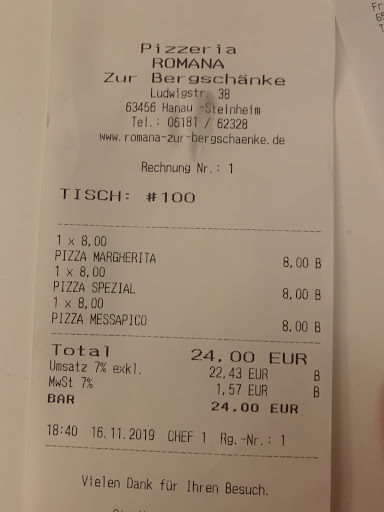 Ein erster Blick: Es keimte Hoffnung. Geschmackvoll wertige moderne Ausstattung. Die Karte sehr klein, schade. Doch halt, der freundliche Kellner, der seinen Job noch gelernt hat, schleppte eine Tafel mit Meckereien an, welche die Auswahl erschwerte. Und auf Nachfrage gab es weitere Ideen. Wer in Hanau (!), in Steinheim gar, vorzüglich in schönen Ambiente bei herzlichen professionellen Service speisen will, sollte die Vielzahl von Nepp-Läden in Frankfurt mal auslasen und das Romana versuchen. Es wäre unendlich schade, wenn der Laden an der zugegeben falschen Stelle auf eine Pizzeria zurückfallen muss. Wir...